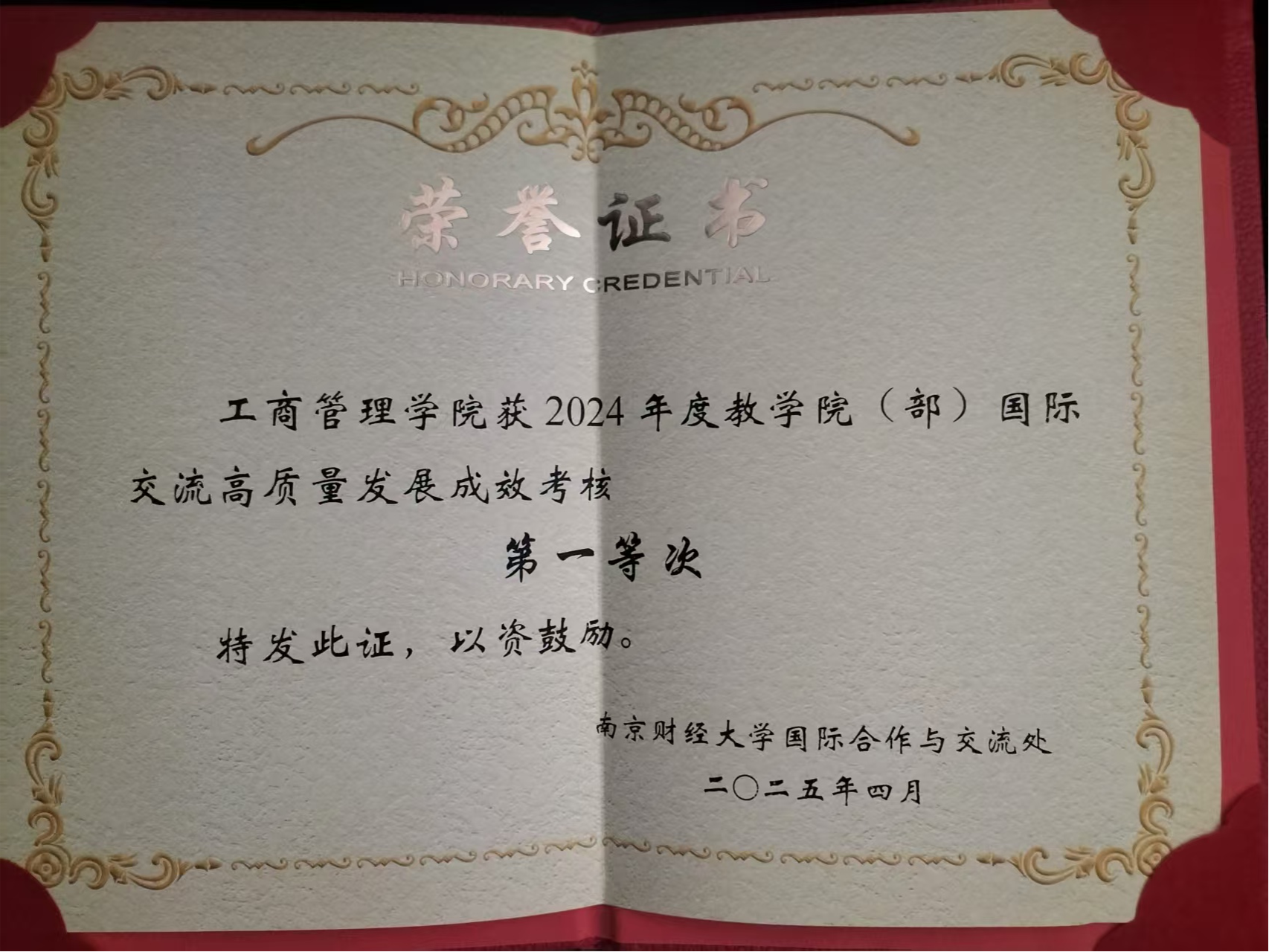 近日,学院喜获2024年度教学院(部)国际交流高质量发展成效考核第一等次。