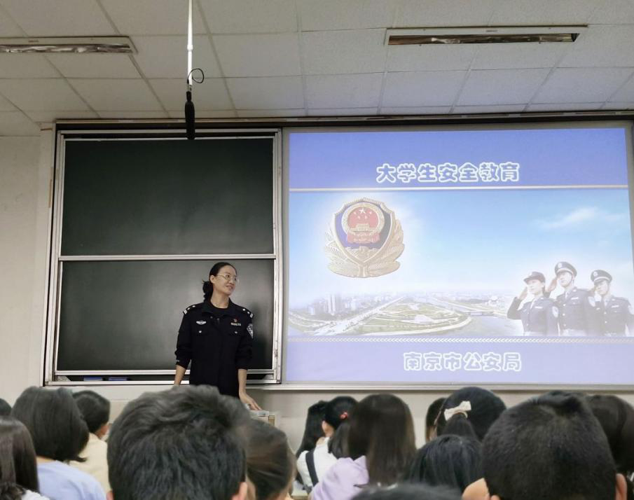 2019级新生安全教育讲座在我校仙林校区博观楼JB-201举行。本次讲座特邀仙林派出所徐静警官主讲,由学院党委书记万绪才主持,学工秘书邱祥霞、辅导员杨振宇以及工商管理、人力资源管理和旅游管理专业2019级全体新生参加了此次讲座。