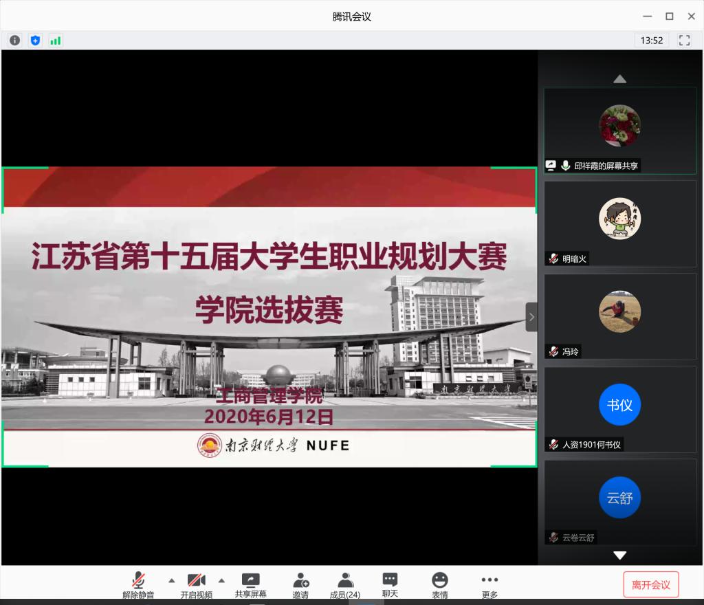 通过腾讯会议举办了第十五届大学生职业生涯规划大赛学院选拔赛,经过前期职业生涯规划书的筛选,共有14位选手脱颖而出进入决赛。教育部职业指导师、全球职业生涯规划师、江苏省教育厅就创业指导专家、妖精视频