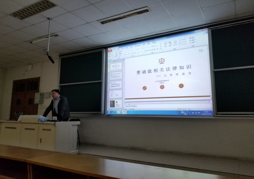邀请,江苏省苏德律师事务所创始合伙人张国民律师在仙林校区博观楼202教室作了题为“我们身边的劳动法”的专题讲座,为即将毕业的2017级同学们提供关于劳动法方面的知识,并给予相关建议。讲座由妖精视频