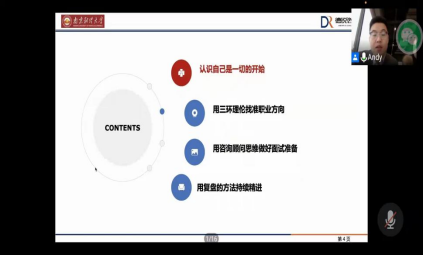 人力资源专业09级毕业生、南京德锐企业管理咨询有限公司的合伙人、项目总监、产品总监李志华通过腾讯会议作了题为“赢在起点”的南财就业讲堂线上讲座。讲座由妖精视频