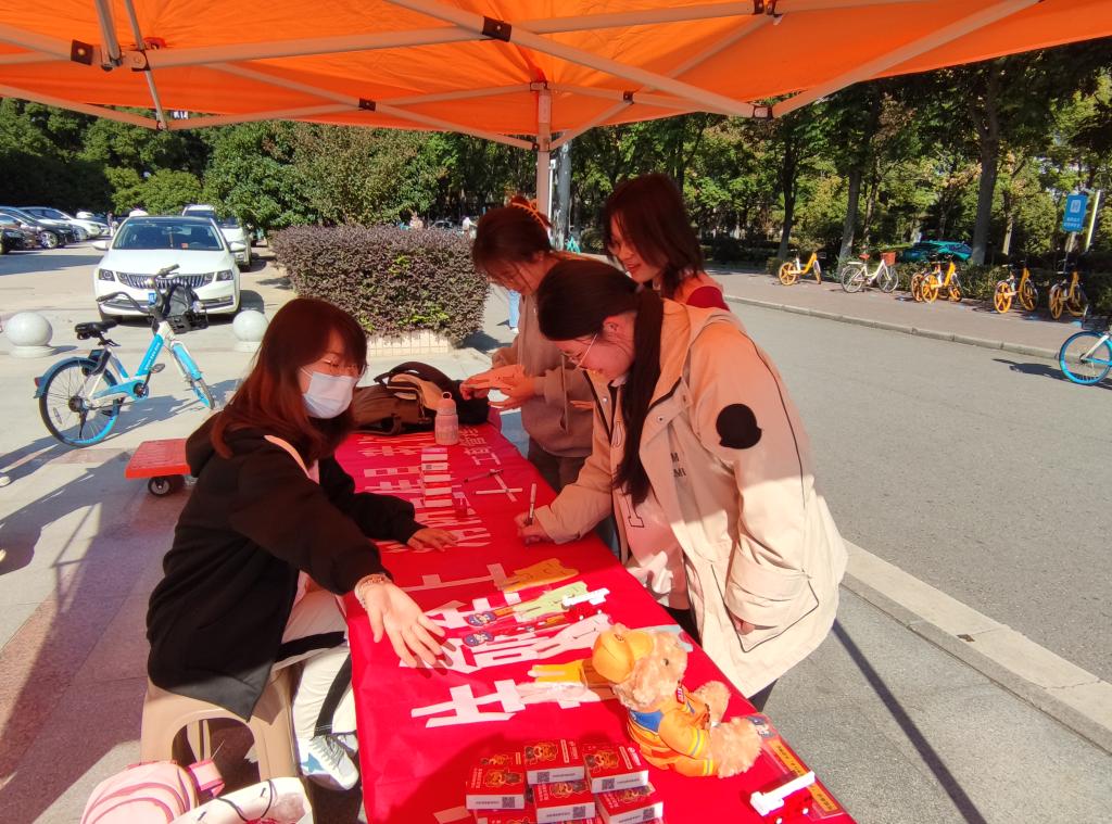 本次活动由消防知识问答和横幅签名两部分组成。活动设置消防知识小问答环节,路过的同学们纷纷参与其中,学习有关消防的实用技能,进一步加强了对消防安全知识的了解,树立起防患于未然的安全意识,同时收获一份精美的消防礼品。此次活动反响热烈,同学们纷纷在横幅上签名,留下消防安全标语,让消防安全意识扎根于心。