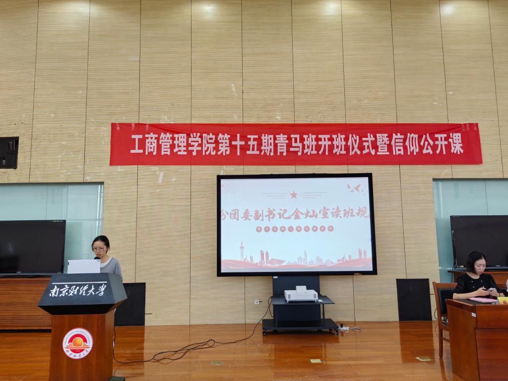 第十五期青马班纪律及注意事项,并从课程基本内容和要求、优秀学员评选规则等方面进行介绍。接着,第十四期青马班优秀学员代表吴佳璐上台发言。她表示,青马班不仅是一个学习的平台,更是一个精神的象征,一个品格的磨砺石,希望同学们珍惜学习机会,保持谦逊、严谨、积极、务实的态度,将个人理想追求融入到国家和民族的伟大梦想之中。