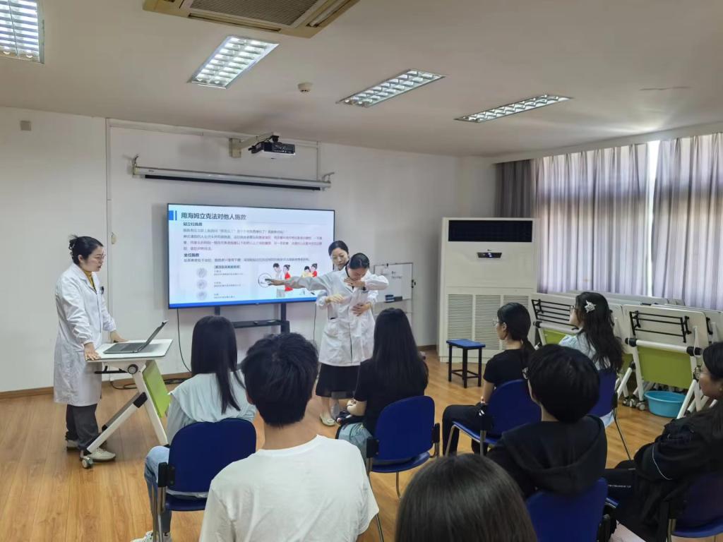活动伊始,医护人员首先介绍了心脏骤停的定义和原因,以及心脏骤停的病情判断与临床表现,强调了“黄金4分钟”的重要性,让同学们更加清楚地了解到了有关心脏骤停的专业知识。随后,医护人员为同学们详细讲解心肺复苏的具体操作方法和注意事项,并邀请现场同学实地体验心肺复苏。