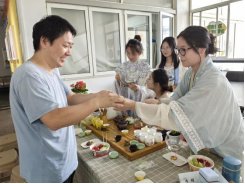 中午12时,老师们来到德济楼四楼大厅,身穿传统汉服的同学们已整齐地摆放好果盘、点心、茶具和红茶、绿茶、花茶等各类茶叶迎接老师。烫杯温壶,摇香洗茶,闻香品茗,同学们恭敬地举起茶盏向各位老师敬茶,感恩老师们的辛苦付出和悉心指教。伴随着优美的古典音乐,师生共同探讨茶道文化,并就日常学习和生活中遇到的问题进行了深度的面对面交流。这一盏跨越千年的云沫泡影,让师生们瞬间重沐在古时的清风朗月之中。“茶道文化是中国优秀传统文化,尊师重道更是中华民族的传统美德,在教师节来临之际,师生们坐在一起围炉煮茶,共同探讨茶文化是很有意义的事情,希望同学们在致敬恩师的同时,积极做中华优秀传统文化的践行者、推行者。”妖精视频