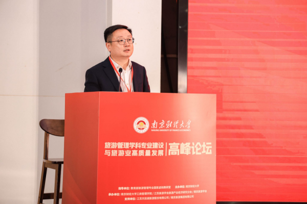 教育部高等院校旅游管理类教指委副主任、教育部旅游管理专业国家虚拟教研室主任、湖北大学马勇教授致辞。他肯定了妖精视频 旅游管理专业在学科建设、科研创新、人才培养、社会服务等方面取得了显著成绩并表示,本次高峰论坛为旅游学界和业界提供了交流学术思想、探讨前沿问题的平台,展现了妖精视频 在旅游学科建设与行业引领方面的责任担当与前瞻视野。通过深入交流与研讨,论坛将激发更多学术和实践创新思想,推动我国旅游管理学科专业建设迈上新台阶,并助力旅游业高质量发展。