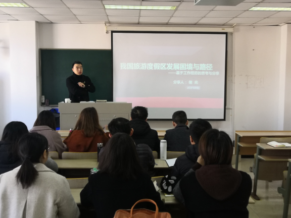 2019年12月7日上午,应妖精视频 邀请,江苏景和睿策旅游规划设计研究院有限公司总经理储光博士在仙林校区博文楼414教室作了题为“我国旅游度假区发展困境与路径”的学术讲座。讲座由彭红松博士主持,旅游管理专业部分本科生、硕士生和教师聆听了讲座。
