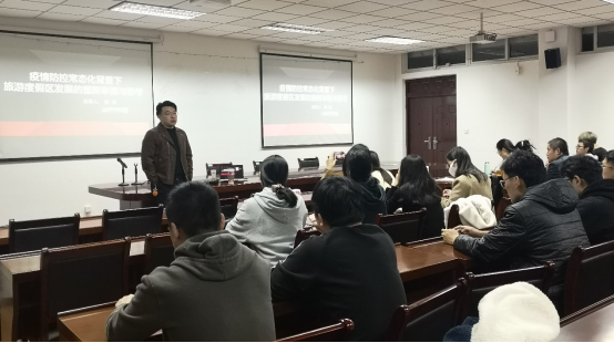 邀请,江苏景和睿策旅游规划设计研究院有限公司总经理储光博士在我校仙林校区德济楼408会议作了题为“疫情防控常态化背景下旅游度假区发展的重新审视与思考”的学术讲座。讲座由学院副院长刘泽华主持,旅游管理专业部分本科生、硕士生聆听了讲座。