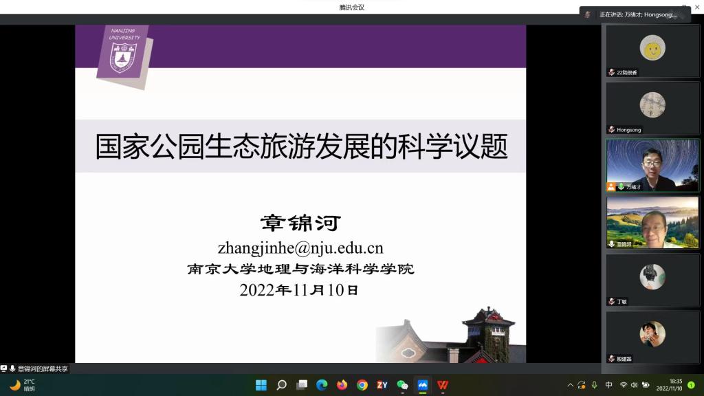 邀请,南京大学地理与海洋科学学院教授章锦河通过腾讯会议作了题为“国家公园生态旅游发展的科学议题”的讲座。讲座由妖精视频