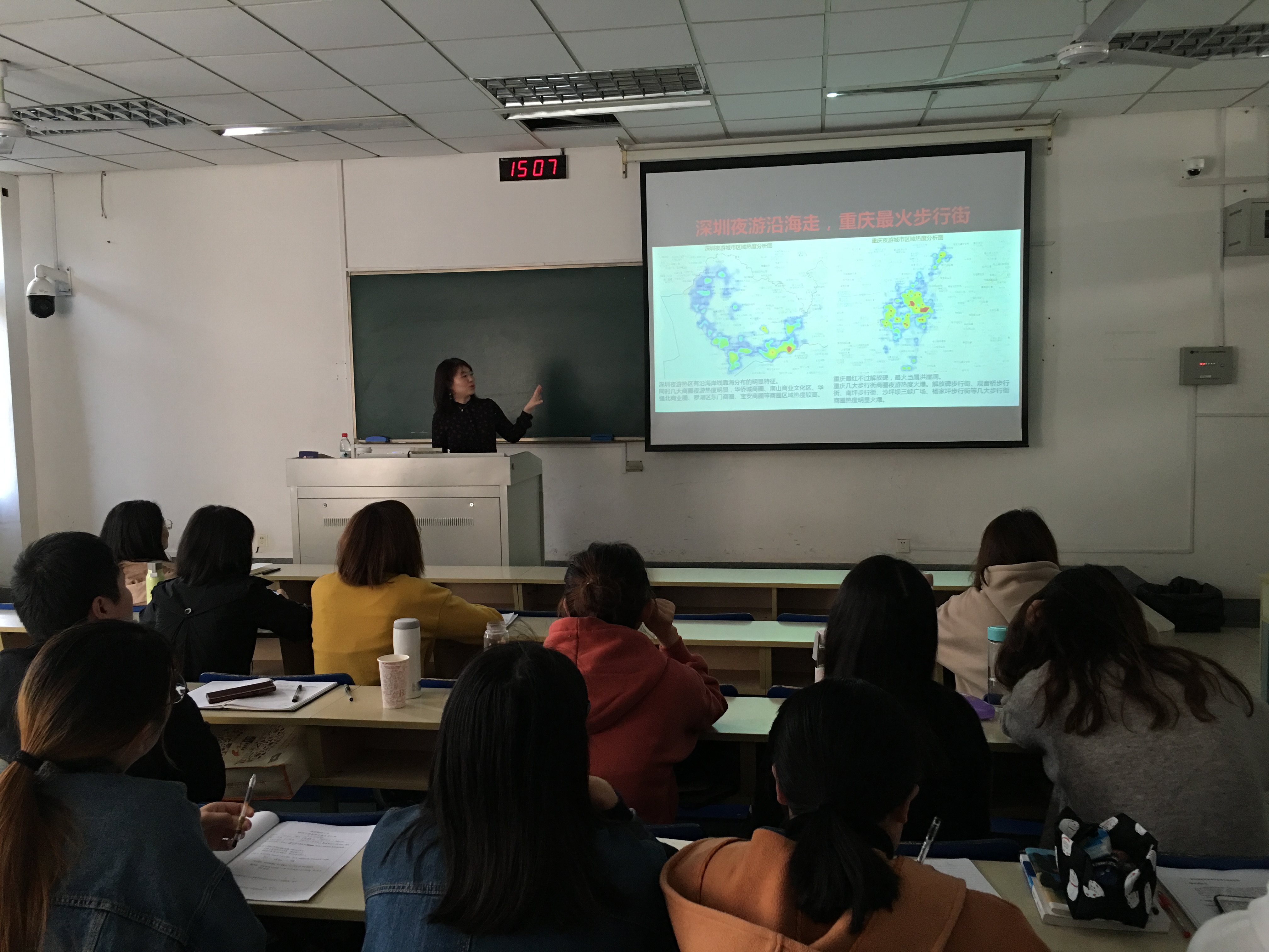 报告首先对夜游经济产生的背景进行分析,介绍了夜游经济的概念、发展现状和重要作用。其次通过丰富翔实的国内外经典案例,对“夜景、夜演、夜宴、夜购、夜娱、夜宿”的“六夜”理论进行了深入浅出、生动透彻的讲解。最后,刘佳博士就夜游经济面临的机遇与挑战、城市夜游核心竞争力、全球夜游美丽背后的光污染等前沿热点问题,和与会研究生、本科生进行了深入探讨和交流。