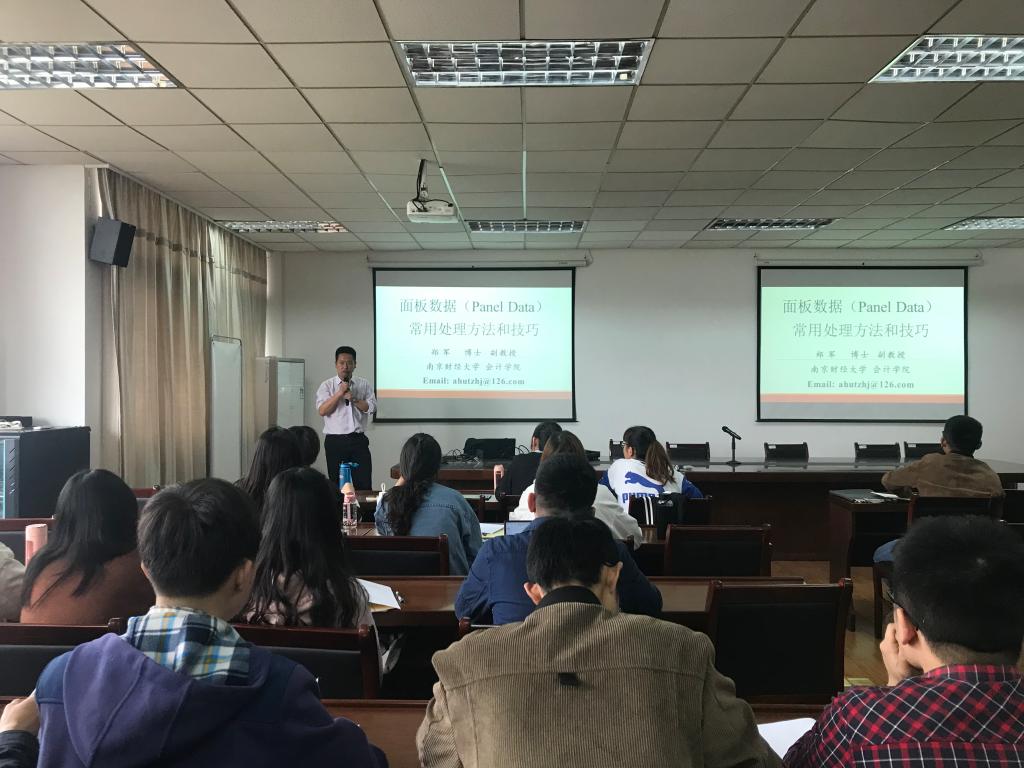 主讲人郑老师凭借自己丰富的学术研究经验,给与会师生详细首先讲解了面板数据的理论知识,例如面板数据的基本概念、类型、目的等,并且通过举例的方式介绍了面板数据的优点,即面板数据偏于控制个体的异质性差异、包含的信息量更大并便于分析动态调整,加强师生们对面板数据的认识;其次,郑老师具体讲解了静态面板数据模型需要关注的问题,如何选择固定效应模型和随机效应模型,如何选择恰当的回归模型,并介绍在stata中的基本操作代码;然后,郑老师介绍了常见的内生性问题,如遗漏重要解释变量、联立性问题、测量误差,并介绍了解决内生性问题的常用方法,加强了对内生性问题的认识。最后,郑老师告诉我们数据分析需要丰富的研究经验,需要大家的不断学习与学习,任何一种数据分析的方法都存在缺陷,我们做研究需要选择合适的数据和模型,我们需要提高逻辑力、想象力和诠释力,同时蒋琰老师和杨晶老师对本次讲座进行总结,呼吁同学们对待数据要严谨并要认真做好学术研究。